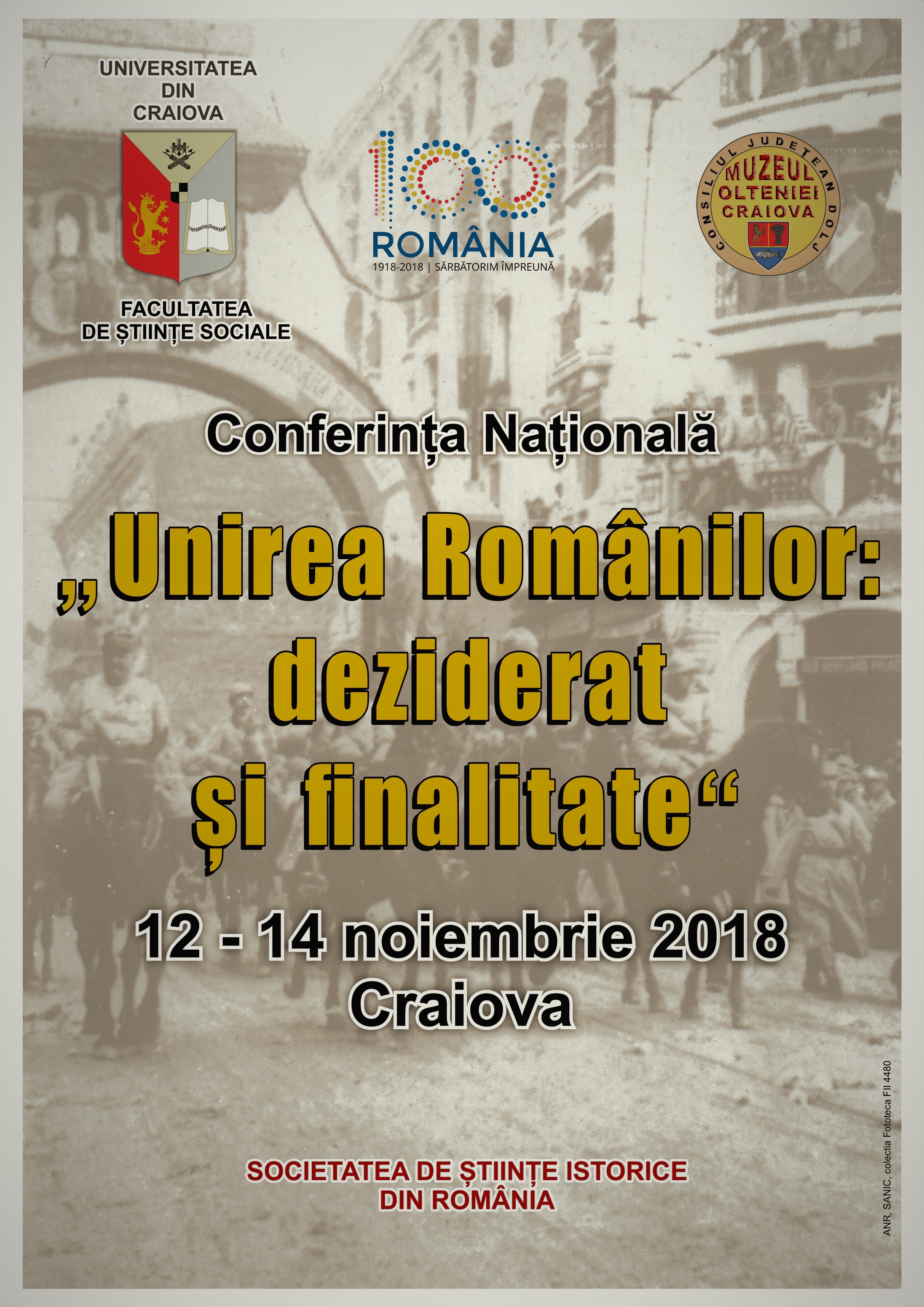 Facultatea de Ştiinţe Sociale a Universităţii din Craiova în parteneriat cu Muzeul Olteniei Craiova şi Societatea de Ştiinţe Istorice din România organizează, cu prilejul Centenarului, în perioada 12-14 noiembrie 2018, Conferinţa Naţională intitulată Unirea românilor: deziderat şi finalitate. Deschiderea lucrărilor Conferinţei va avea loc pe data de 13 noiembrie 2018, la ora 10.00, la „Aula Mihai I al României” a Universităţii din Craiova (clădirea Rectorat). Vor participa la eveniment profesori, cercetători şi muzeografi din ţară. Cu această ocazie, vor fi vernisate două expoziţii de fotografie şi artă digitală dedicate Centenarului şi vor avea loc lansări de carte.