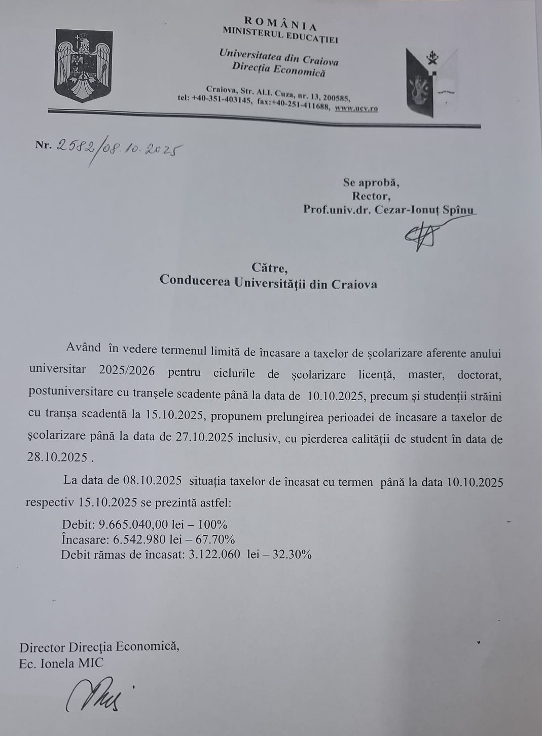 Prelungirea perioadei de încasare a taxei de şcolarizare pentru ciclurile de învăţământ licenţă, master, doctorat şi studii postuniversitare , cu data scadenta în 10.10.2025 cât şi pentru studenţii străini cu data scadentă în 15.10.2025 până pe data de 27.10.2025 inclusiv.