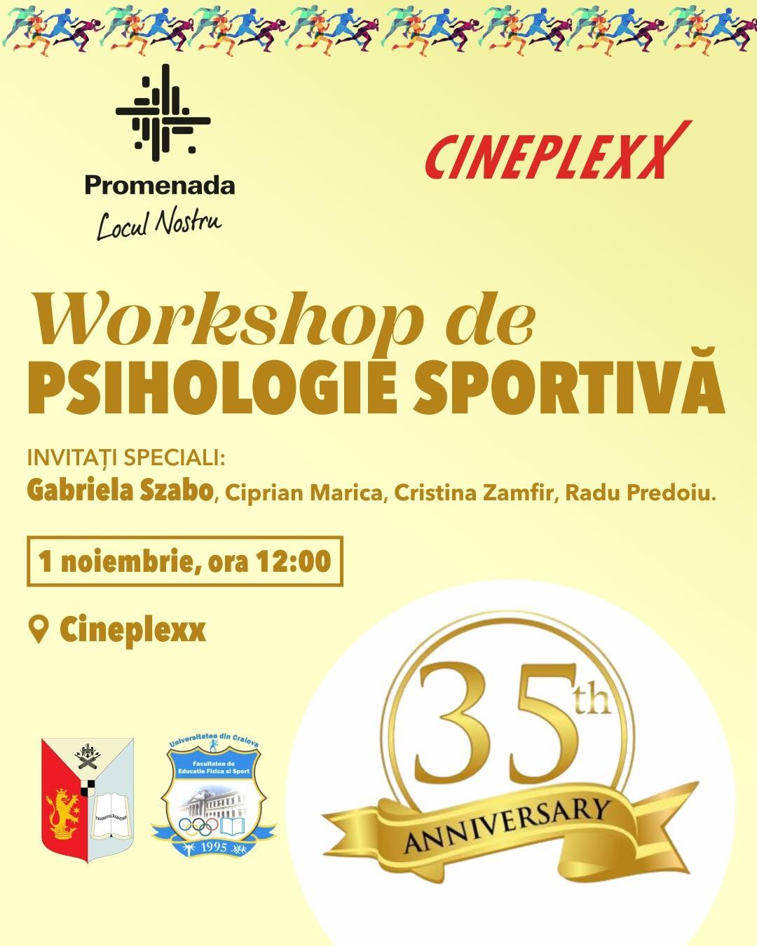 De asemenea, cu ocazia momentului aniversar, sâmbătă, 1 noiembrie, ora 12:00, va avea loc un workshop de psihologie sportivă organizat laCineplexx Craiova la care vor fi invitați Gabriela Szabo, Ciprian Marica, Cristina Zamfir și expertul în psihologie sportivă Radu Predoiu.