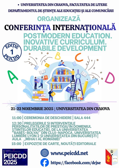 Departamentul de Științe ale Educației și ale Comunicării din cadrul Universității din Craiova organizează Conferința Internațională „Postmodern Education. Innovative Curriculum. Durable Development” (PEICDD 2025).