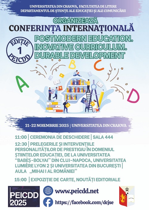 Departamentul de Științe ale Educației și ale Comunicării din cadrul Universității din Craiova organizează Conferința Internațională „Postmodern Education. Innovative Curriculum. Durable Development” (PEICDD 2025).