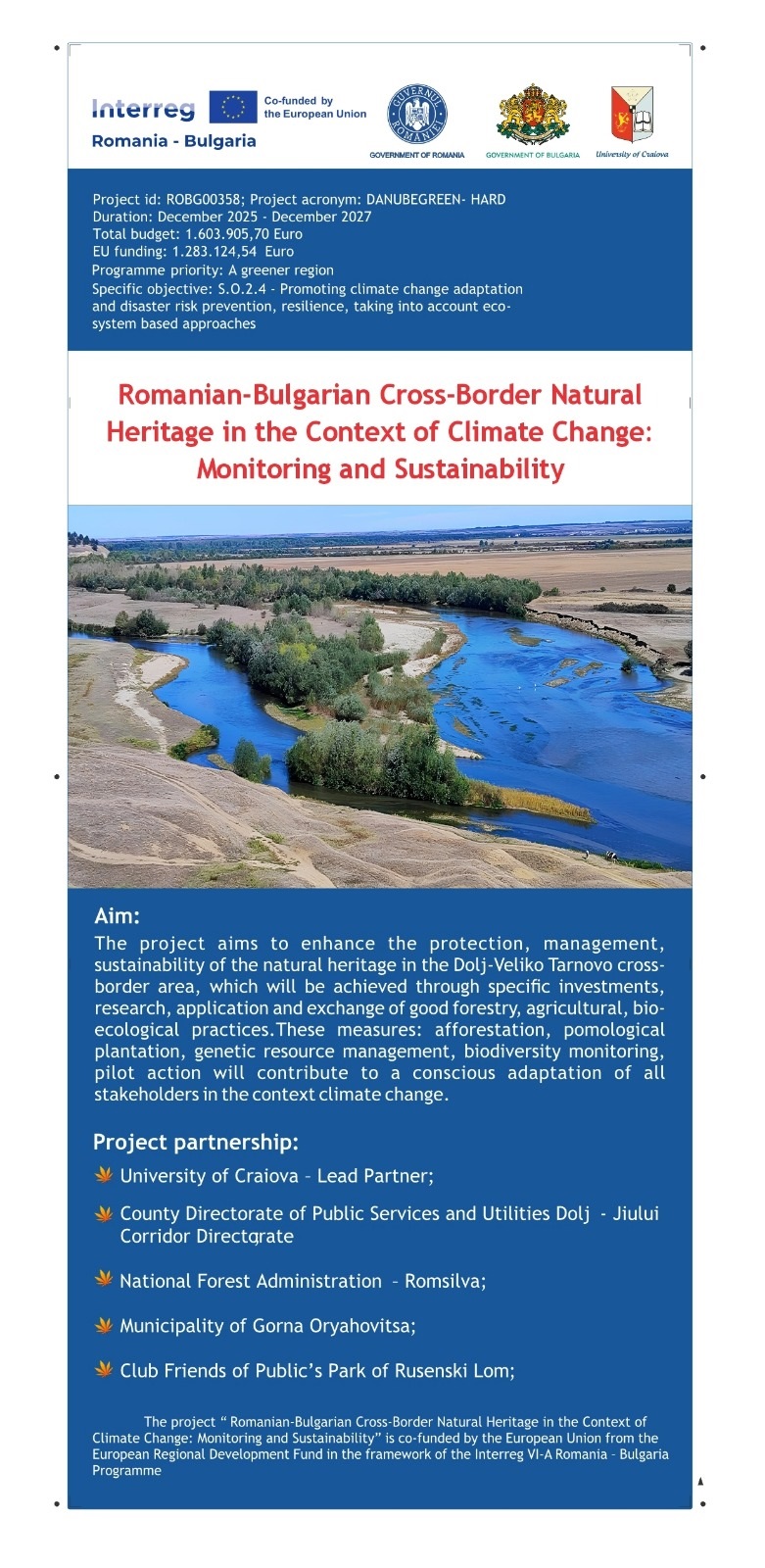 Primul proiect, „Romanian-Bulgarian Cross-Border Natural Heritage in the Context of Climate Change: Monitoring and Sustainability” (ROBG 00358), are o valoare totală de 1.603.905,70 euro și este implementat în parteneriat cu Consiliul Județean Dolj, Regia Națională a Pădurilor Romsilva – Direcția Silvică Dolj, Municipalitatea Gorna Oryahovitsa și Universitatea „Konstantin Preslavsky” din Shumen și Clubul Prietenilor Parcului Public Rusenski Lom. Inițiativa are ca obiectiv creșterea nivelului de protecție și gestionare sustenabilă a patrimoniului natural din zona Dolj – Veliko Târnovo, în contextul schimbărilor climatice. Măsurile care se vor implementa în cadrul proiectului (împăduriri, plantații pomicole, gestionarea resurselor genetice, monitorizarea biodiversității) vor contribui la o adaptare conștientă a tuturor părților implicate în contextul schimbărilor climatice.