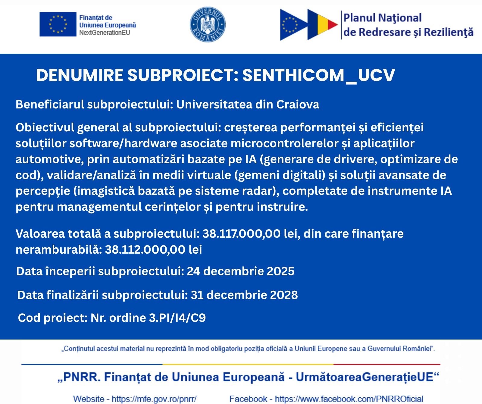 Subproiectul se implementează începând cu data de 24 decembrie 2025, pe o perioadă de 36 de luni, până la data de 31.12.2028, de către Universitatea din Craiova, în calitate de participant indirect (beneficiar).